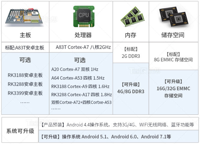 ·標(biāo)配為全志A64 Cortex-A53 四核64位 主頻達(dá)1.5GHz,主板為自主研發(fā),性能更穩(wěn)定,同時(shí)支持配置升級(jí);