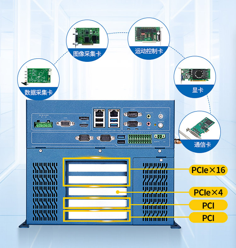 四卡槽版搭載1*PCIe X16、1*PCIe X4、2*32bit PCI共四個(gè)擴(kuò)展插槽,支持高速GPU、圖像采集卡、運(yùn)動控制卡、AI加速等功能配置,可增強(qiáng)特定工業(yè)應(yīng)用的硬件拓展和功能定制彈性。